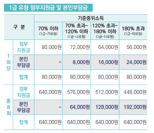 본인부담금은 신청급수별, 중위소득에 따라서 달라지게 되는데, 아래에서 자세하게 확인가능합니다.